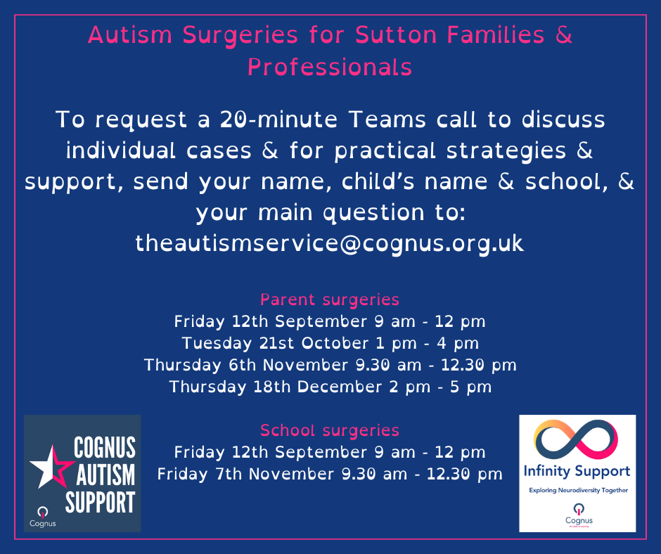 Request a 20-minute Teams call by sending your name, child's name and school, and your main question to theautismservice@cognus.org.uk